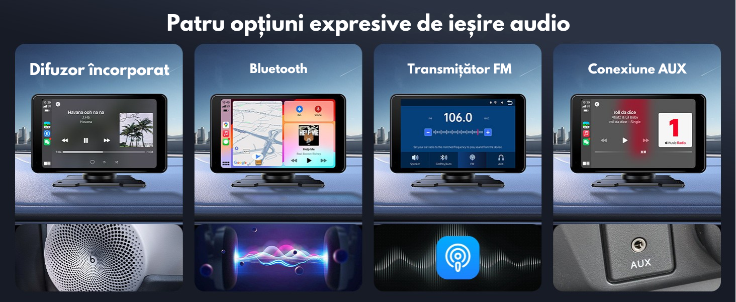 【Actualizare a transmisiei audio】 – Este momentul sa iti modernizezi masina mai veche cu o consola multimedia avansata! Ecranul CarPlay pentru masina este dotat cu un difuzor incorporat, Bluetooth, transmisie FM si port AUX, oferindu-ti optiuni flexibile pentru redarea audio. Toate sunetele vor fi redate prin difuzoarele originale ale masinii. (Nota: Functia FM nu include radio.)