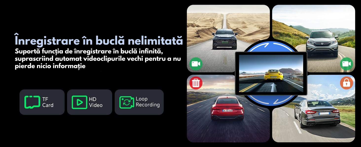 🎥 Inregistrare in bucla nelimitata – Captura video continua cu suprascriere automata pentru a nu pierde nicio filmare esentiala.