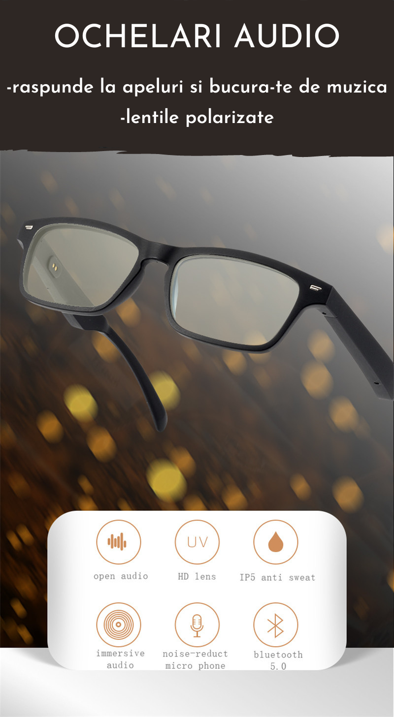 Avand o conectivitate Bluetooth 5.0, ochelarii de soare inteligenti se pot conecta rapid la orice dispozitiv Android sau iOS, asigurand o acoperire stabila pe o distanta de peste 10 metri. Acestia au incorporata functia de casca, permitand ascultarea muzicii favorite sau preluarea apelurilor direct in castile integrate in ramele ochelarilor. Microfonul cu reducere a zgomotului asigura o calitate exceptionala a apelurilor, eliminand zgomotele de fundal nedorite.