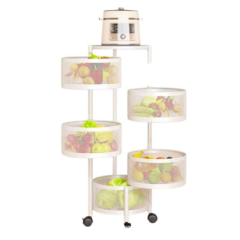 Organizator mobil de bucatarie cu cinci cosuri rotative pentru depozitarea fructelor si legumelor, alb Organizator mobil de bucatarie cu cinci cosuri rotative pentru depozitarea fructelor si legumelor, alb