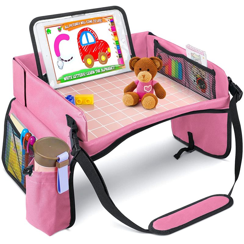 Masuta/organizator auto pentru copii este prevazuta cu margini ridicate ce impiedica jucariile,culorile etc. sa cada si in ambele parti dispune de buzunare incapatoare pentru stocare.