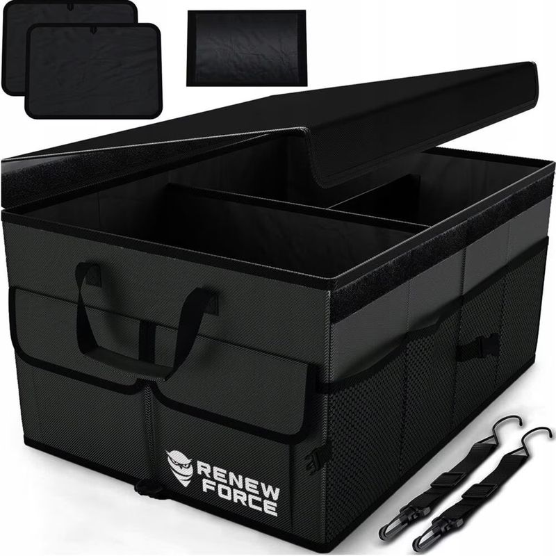 Organizator portbagaj auto Renew Force, geanta multifunctionala, pliabil, 3 compartimente, impermeabil, Capacitate 64 litri, 51 cm x 36 cm x 32 cm, Negru