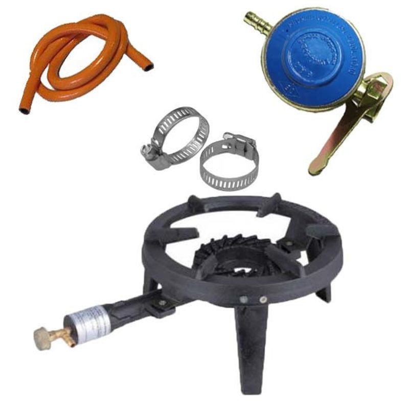 Arzatorul rotund din fonta sau pirostrie cu 3 picioare pentru fixare si stabilitate, se utilizeaza cu butelie pe gaz propan sau butan si un consum de gaz foarte scazut. Cu acest arzator din fonta rotund, vacanta dumneavoastra devine mult mai placuta, fiind foarte usor de folosit si util. Date tehnice: - Presiune: 28-30 mbar. - Gaz: Butan sau propan. - Clasa: 1 3 BP. - Capacitate nominala: 5,33 kw. - Consum gaz: 381 g/h. Dimensiuni: Inaltime: 16 cm Lungime: 46 cm Diametrul cercului interior: 13 cm Diametrul cercului exterior: 28 cm Furtunul pentru butelie este confectionat din PVC flexibil, cu insertie textila, destinat pentru transferul gazului in domeniul casnic. Colierul confectionat din metal tratat si intarit, foarte rezistent, ce poate fi reglat manual prin surubul cu care este prevazut. Acesta este utilizat in general pentru a ermetiza prin strangere puternica a furtunelor de gaz, de apa, furtunelor pentru pistolul de spalatorie, futunului de la masina de spalat, etc. Acest inel de etansare este realizat, astfel incat sa reziste in timp fara ca acesta sa se rupa sau sa crape. Utilizat cu incredere de catre toti instalatorii, colierul este un accesoriu de nelipsit din trusa cu piese. Dimensiuni: Diametru minim: 13 mm Diametru maxim: 19 mm Latime: 9 mm Greutate: 5 g Ceasul de butelie cu cheie si filet este un regulator pentru gaz confectionat din materiale de calitate superioara, ceea ce confera o rezistenta si siguranta sporita. Acest ceas este foarte simplu de utilizat: doar conectati furtunul de gaz la regulator, iar ulterior pe amandoua la butelie si cealalta sursa unde doriti sa realizati transferul. Ceasul de butelie se utilizeaza cu furtun de 8 mm. Atentie: In cazul oricarei scurgeri de gaz, nu utilizati nici un fel de intrerupator electric. Inchideti robinetul buteliei si deschideti usile si ferestrele. Daca butelia se afla in spatiu inchis, mutati-o afara. Indepartati orice flacara din apropiere. Intrucat gazul este mai greu decat aerul, se va acumula jos la podea. Asadar, maturati podeaua spre iesire la aer pentru a scoate orice urma de gaz afara. Dimensiuni: Lungime: 12 cm Latime: 7.5 cm Inaltime: 4 cm Greutate: 150 g Presiune de intrare: ~ 0.3 - 16 mbar Presiune de iesire: ~ 29 mbar Capacitate: 0 - 1.5 kg/ora Material: Metal