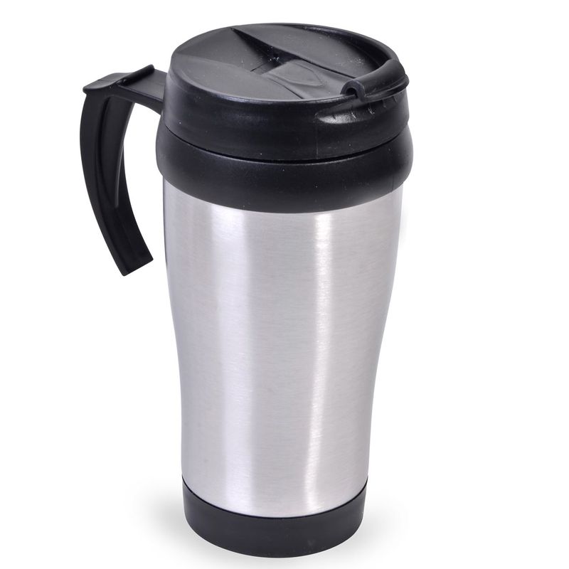 Pahar metalic cafea, capacitate 450ml, cu maner si capac plastic negru Pahar metalic cafea, capacitate 450ml, cu maner si capac plastic negru