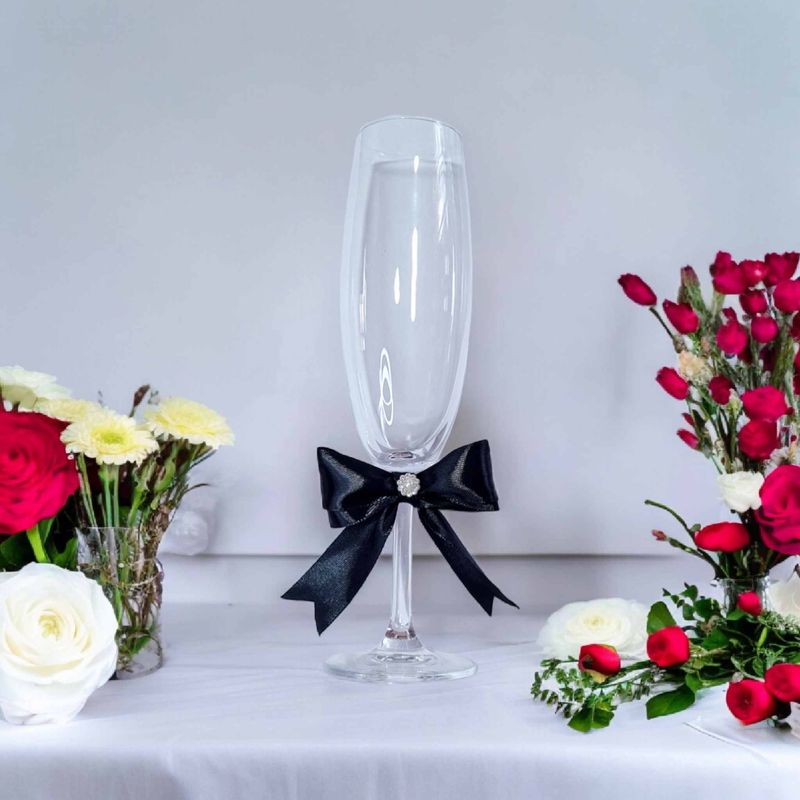 Pahar nunta, miri, nasi cu fundita de satin neagra si cristal Pahar nunta, miri, nasi cu fundita de satin neagra si cristal