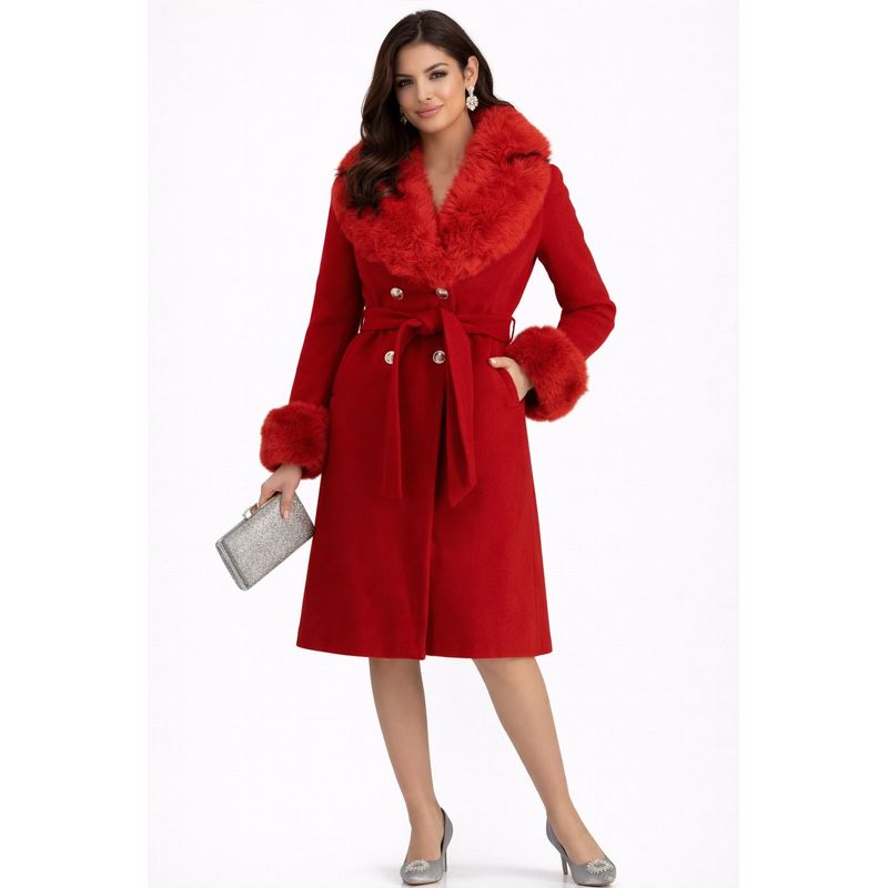 Palton dama din stofa cambrat, cu guler din blana ecologica detasabil Palton dama din stofa cambrat, cu guler din blana ecologica detasabil L INTL Rosu
