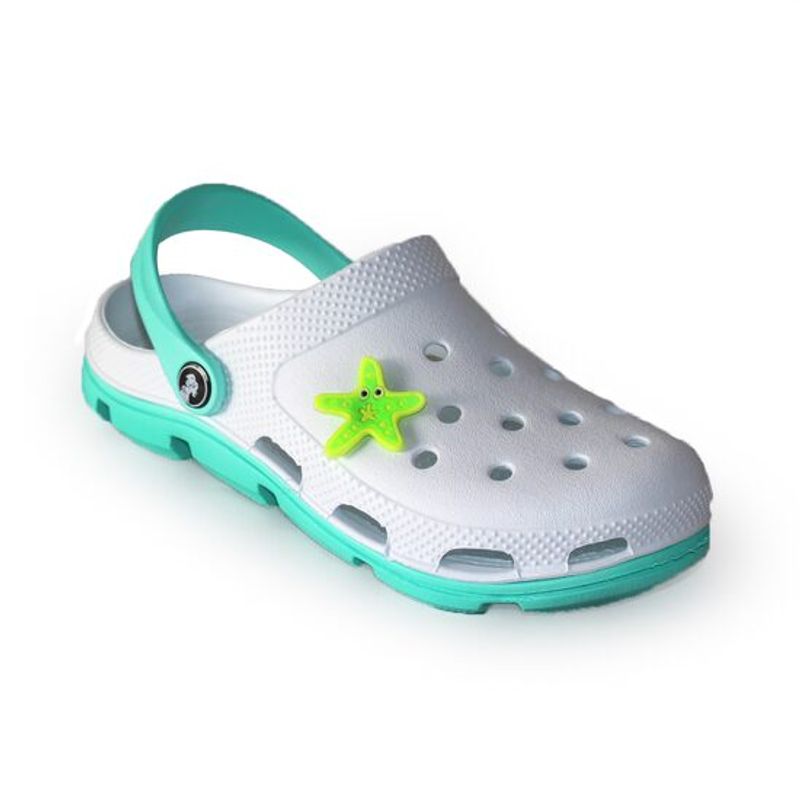 Papuci/saboti, clogs, pentru femei, spuma EVA, alb si turcoazCaracteristici:- Sunt incaltaminte practica si confortabila, realizata din polimer modern EVA. Datorita proprietatilor acestui material, incaltamintea este usoara, rezistenta, fara miros, impermeabila, usor de curatat si se usuca rapid.