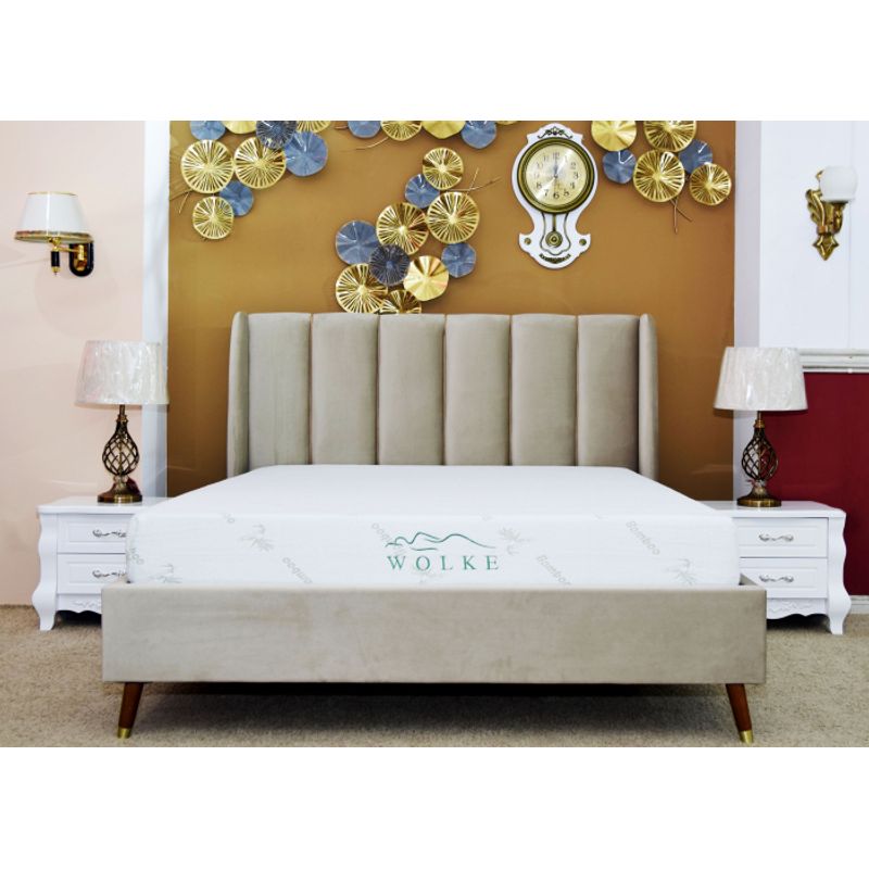 Pat Belmonde, 160 x 200 cm, tapitat catifea bej, somiera inclusa Pat Belmonde, 160 x 200 cm, tapitat catifea bej, somiera inclusa