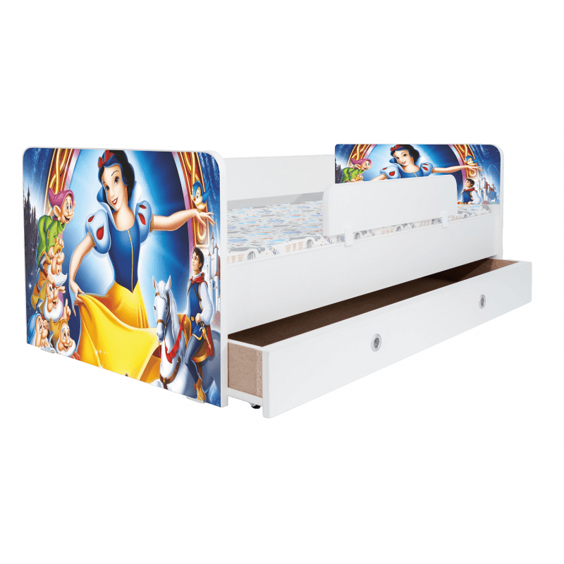 Pat pentru copii Kiddy Alba ca Zapada, 130x60 cm, cu sertar, alb/multicolor, saltea inclusa Pat pentru copii Kiddy Alba ca Zapada, 130x60 cm, cu sertar, alb/multicolor, saltea inclusa