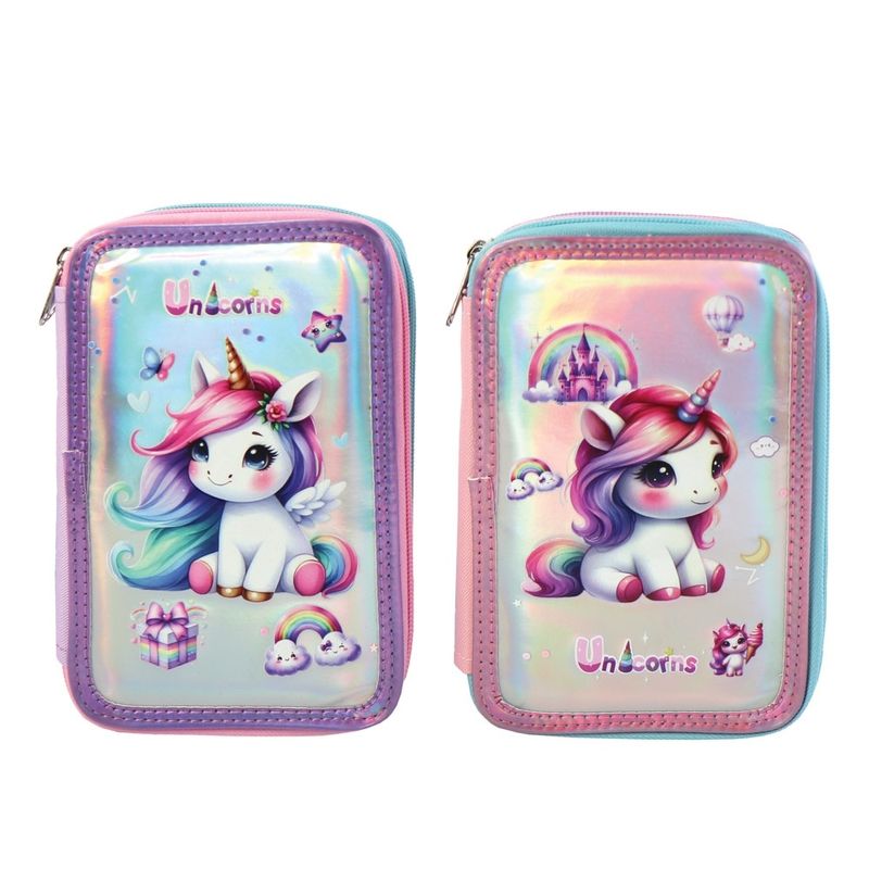 - Penarul este realizat din poliester. Exteriorul si interiorul sunt intarite, iar exteriorul penarului este buretat pentru un plus de protectie a continutului. Fata penarului este din PVC cu desene cu unicorn.