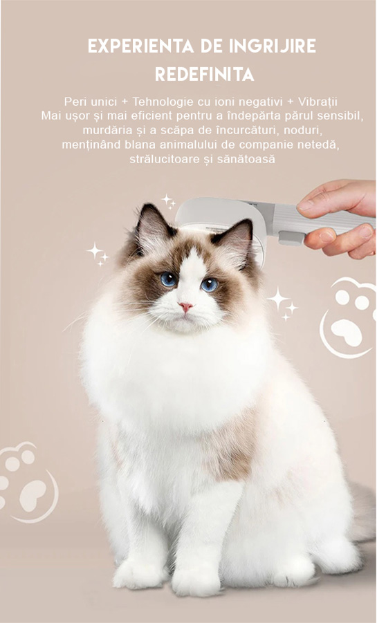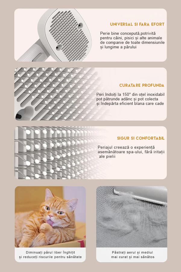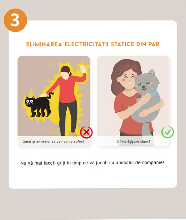 Nu mai fiti speriati de socurile de electricitate statica cand va jucati cu pisicile si cainii in timpul toamnei si iernii. Peria are capacitatea de a descarca electricitatea statica aflata in blana animalului de companie.