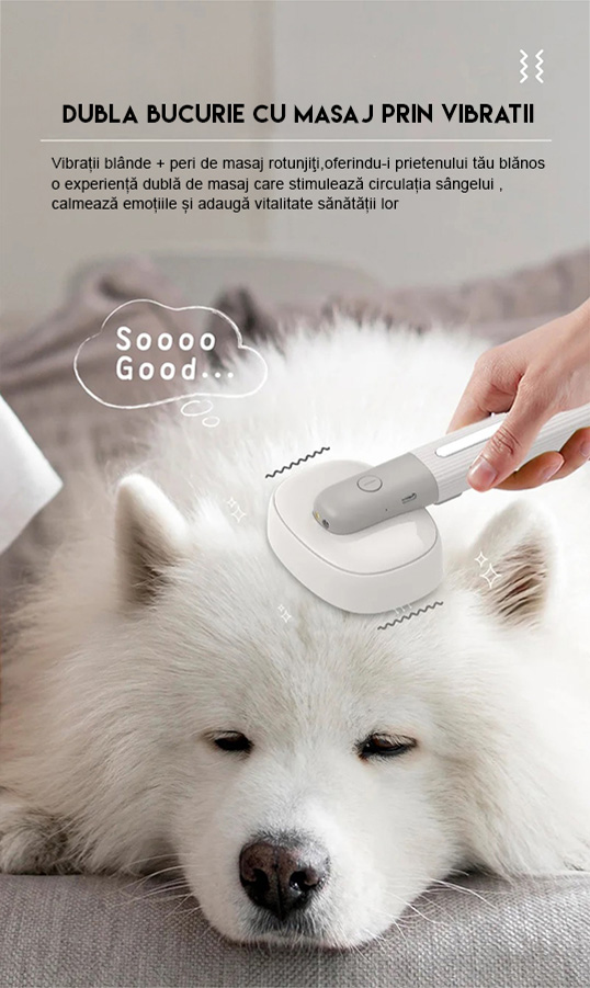 Margelele rotunde de masaj aplica presiune in timp ce motorul cu 11.000 RPM furnizeaza o vibratie blanda, oferind prietenului dumneavoastra pufos o experienta dubla de masaj care stimuleaza circulatia sangelui, calmeaza emotiile si adauga vitalitate sanatatii lor.