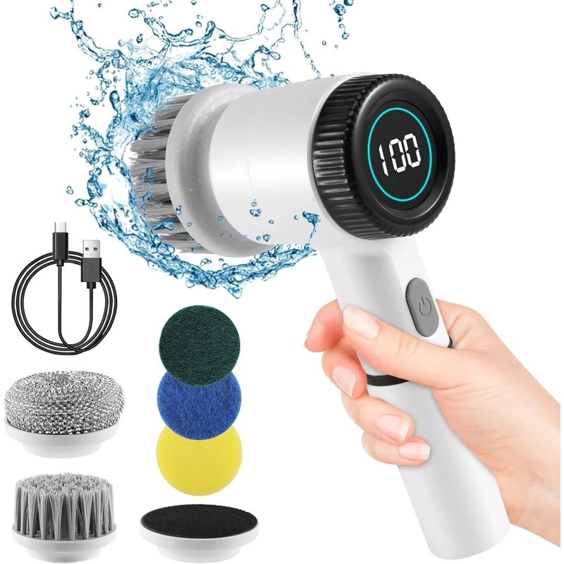 Perie electrica rotativa, fara fir, 5 in 1, pentru curatenia casei, 3 viteze, incarcare USB, 5 capete, acumulator 1200mAh, rezistenta la apa, afisaj digital, alb