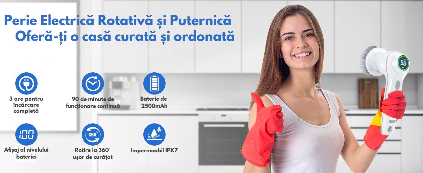 Transforma curatenia intr-o activitate rapida si usoara cu aceasta perie electrica multifunctionala, ideala pentru toate suprafetele din casa! Cu un design ergonomic, motor puternic si capete interschimbabile, aceasta perie este solutia perfecta pentru petele dificile si murdaria persistenta.