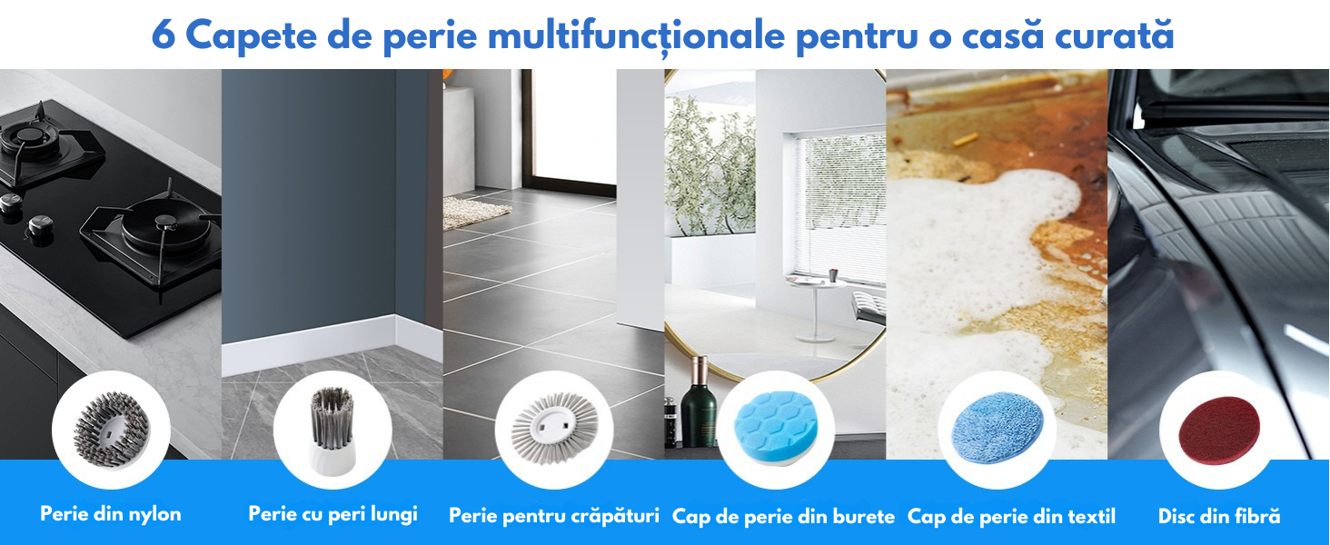 - Capete de perie interschimbabile: Include 6 accesorii special concepute pentru diverse nevoi – perie din nylon, perie pentru fisuri, burete, perie textila, disc din fibra si perie pentru colturi.