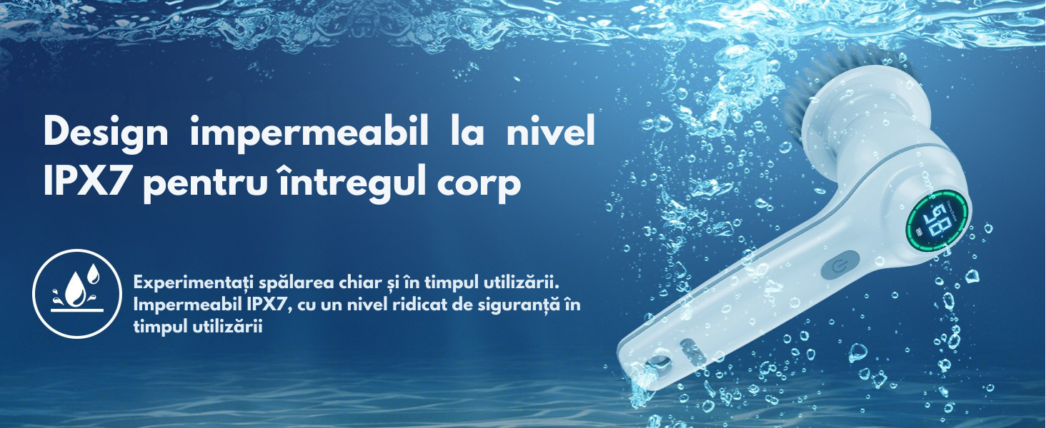 - Design impermeabil (IPX7): Poate fi utilizata fara griji chiar si pe suprafetele umede.