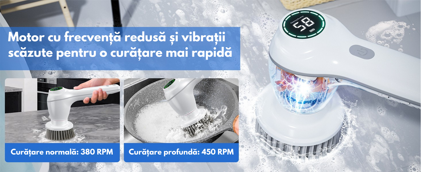 - Putere si eficienta: Doua viteze reglabile de rotatie (380 RPM si 450 RPM) pentru curatare normala sau profunda.