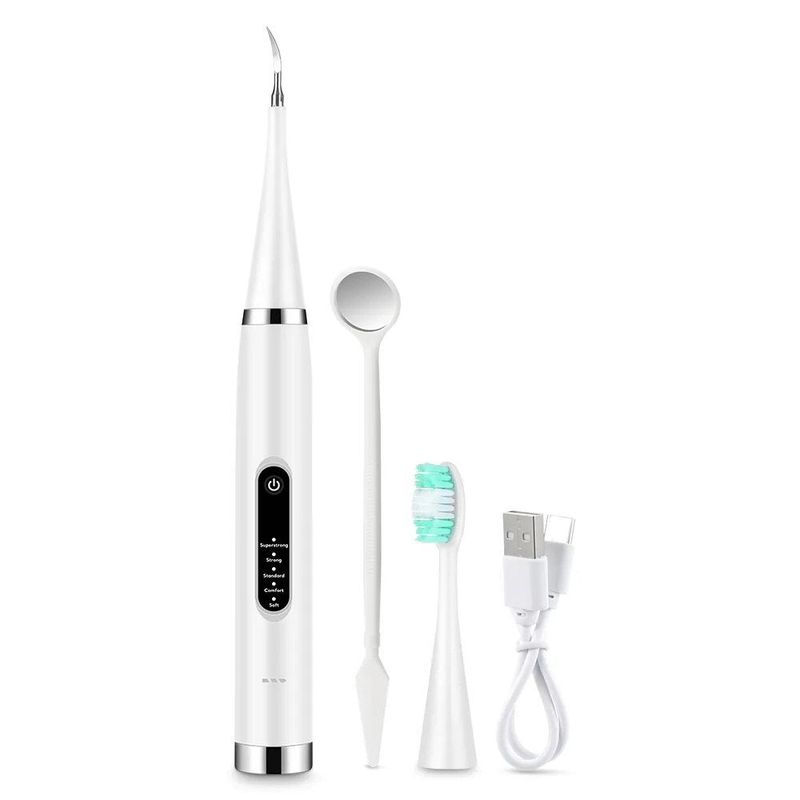 4. Accesorii multiple - Un capat de periuta de dinti inlocuibil, o oglinda, un cap din otel de calitate pentru a indeparta tartrul si cablu USB pentru incarcare.