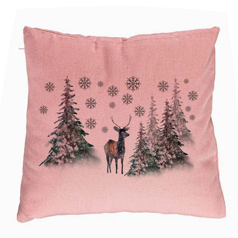 Perna Decorativa de Craciun, Peisaj Brazi si Cerb, 40x40 cm, Roz, Husa Detasabila, Burduf Perna Decorativa de Craciun, Peisaj Brazi si Cerb, 40x40 cm, Roz, Husa Detasabila, Burduf