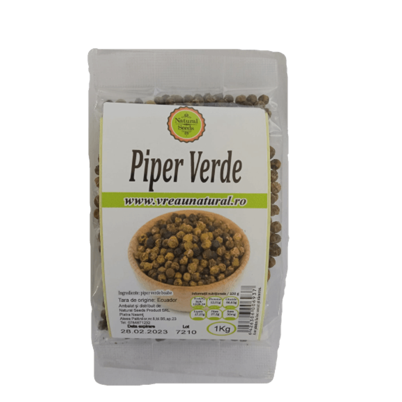 Piperul verde inseamna, asa cum va puteti da seama, boabe crude de piper. Aceste boabe sunt uscate astfel incat sa-si mentina culoarea verde. Sunt utilizate metode precum tratarea cu dioxid de sulf, conservarea sau liofilizarea. Cel mai frecvent intalnim piperul verde in bucataria asiatica, mai ales in cea thailandeza. Piperul cunoscut si ca regele mirodeniilor, are o incarcatura de beneficii pentru sanatate si un beneficiu major al consumului de piper este faptul ca ajuta la pierderea in greutate. De asemenea, se spune ca este bun pentru digestie si previne cancerul prin detoxifierea organismului. Cand acest condiment este adaugat in mancare, face ca mancarea ta sa aiba un gust mai bun si mai picant.