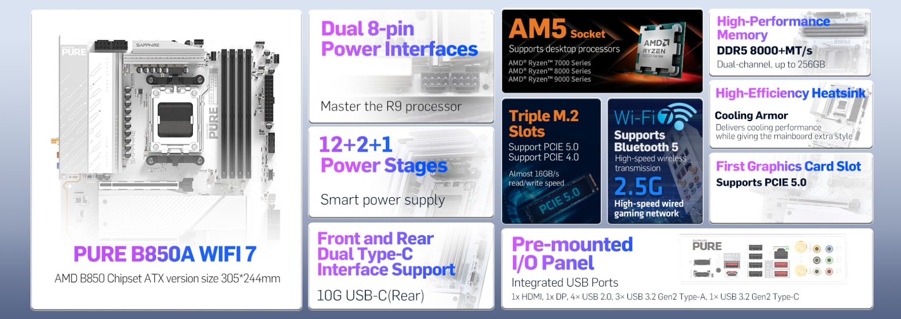 Placa de baza SAPPHIRE PURE B850A WIFI 7, Socket AM5 Placa de baza SAPPHIRE PURE B850A WIFI 7, Socket AM5