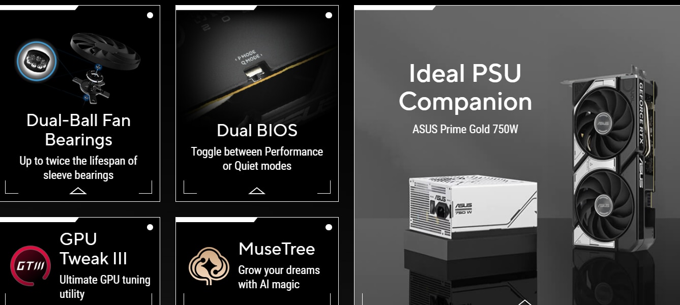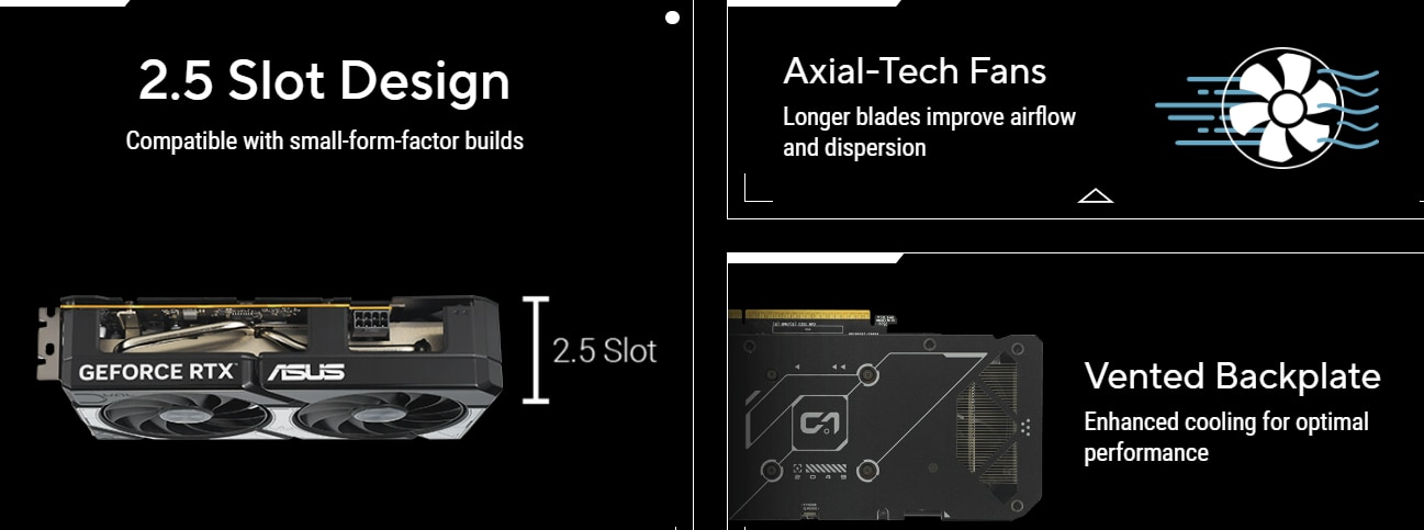ASUS Dual GeForce RTX™ 5060 combina performanta termica puternica cu o compatibilitate extinsa. Solutiile avansate de racire preluate de la placile grafice de top — inclusiv doua ventilatoare Axial-tech pentru optimizarea fluxului de aer catre radiator. Conceputa într-un format compact de 2,5 sloturi, ofera mai multa putere într-un spatiu redus. Aceste îmbunatatiri fac din ASUS Dual alegerea ideala pentru gamerii care îsi doresc performanta grafica de nivel înalt într-un sistem compact.