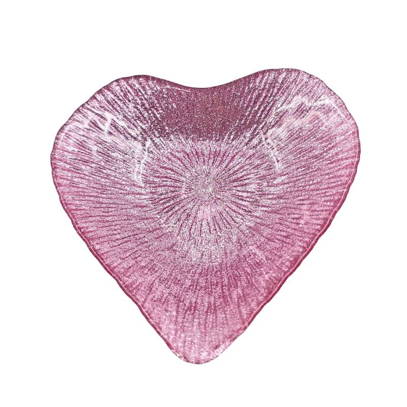 Platou din sticla, in forma de inimioara, 15 cm, roz cu sclipici Platou din sticla, in forma de inimioara, 15 cm, roz cu sclipici