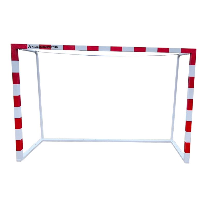 Poarta de handbal Anastasia Sport V2 este realizata din aluminiu dur, cu profil patrat de 80 x 80 mm, prevazut cu canal special pentru prinderea plasei. Barele frontale sunt vopsite electrostatic alb cu dungi rosii, pentru vizibilitate optima si aspect profesional.