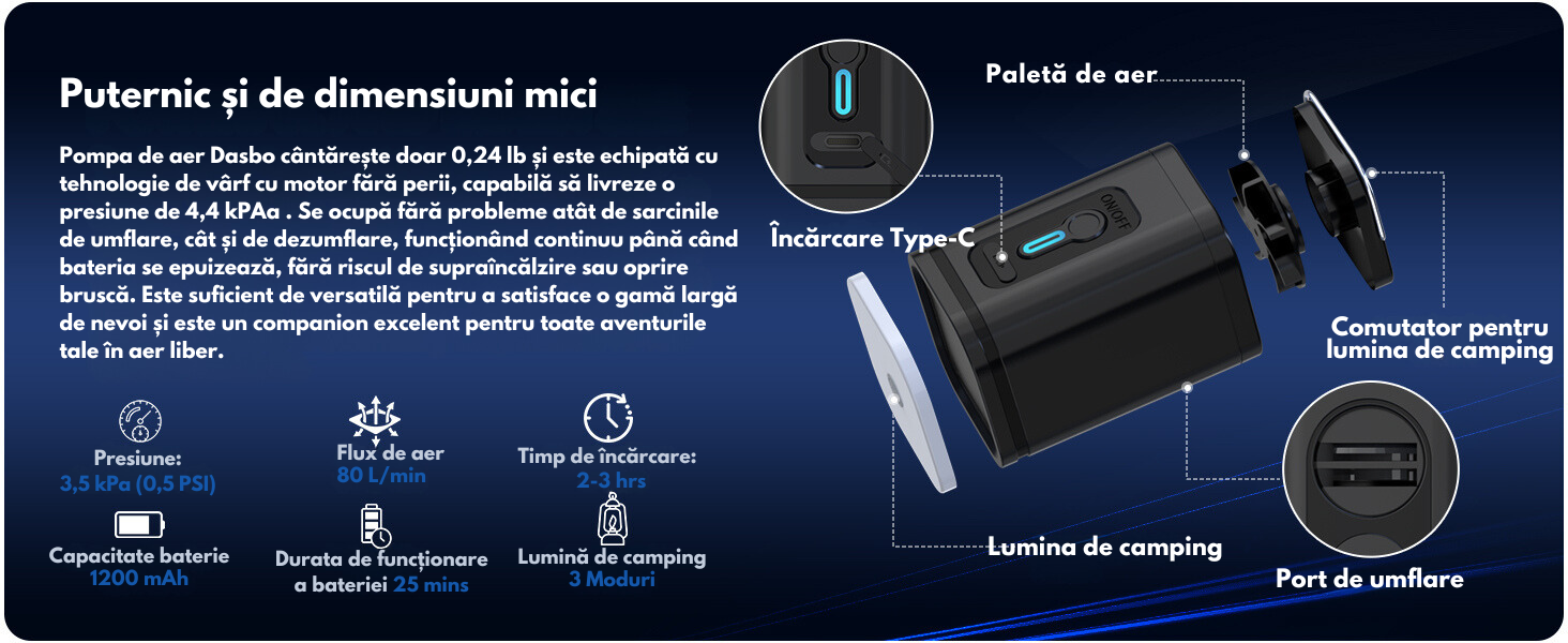- Design 3 in 1: Pompa Mini Air Pump Pro functioneaza ca o pompa de aer portabila, lanterna de camping si pompa de vid, oferind solutia perfecta pentru o gama variata de utilizari, inclusiv umflarea saltelelor de aer, pernelor si colacilor de inot.