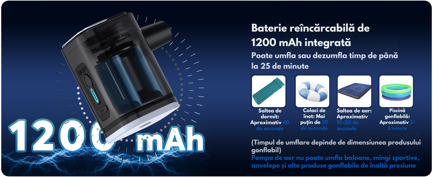- BATERIE REINCARCABILA DE LITIU: pompa de aer dispune de o baterie reincarcabila cu polimer de litiu de 1200 mAh incorporata, care se incarca usor prin interfata de tip C. Se incarca complet in doar 2-3 ore si ofera pana la 25 de minute de functionare continua, satisfacand in mod eficient diferitele nevoi de inflatie
