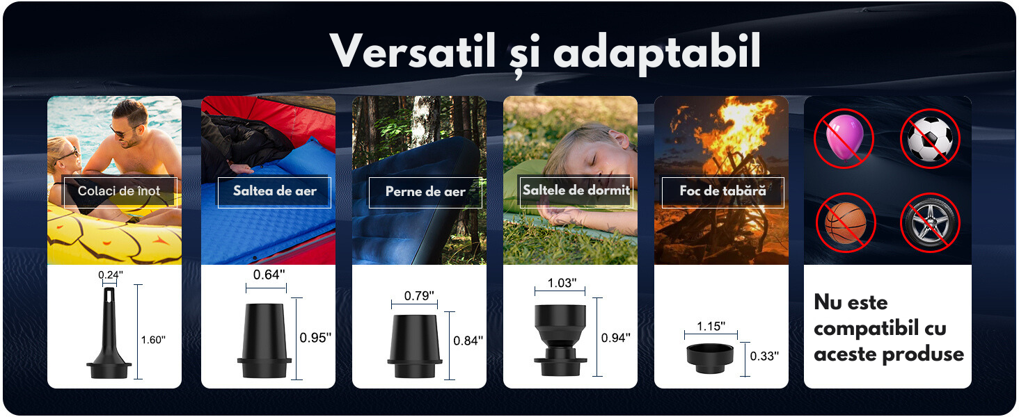 - Utilizare versatila: Ideala pentru saltele de camping, perne de aer, colaci de inot si piscine gonflabile, dar nu este compatibila cu produse de inalta presiune, cum ar fi baloane, mingi sportive sau anvelope.