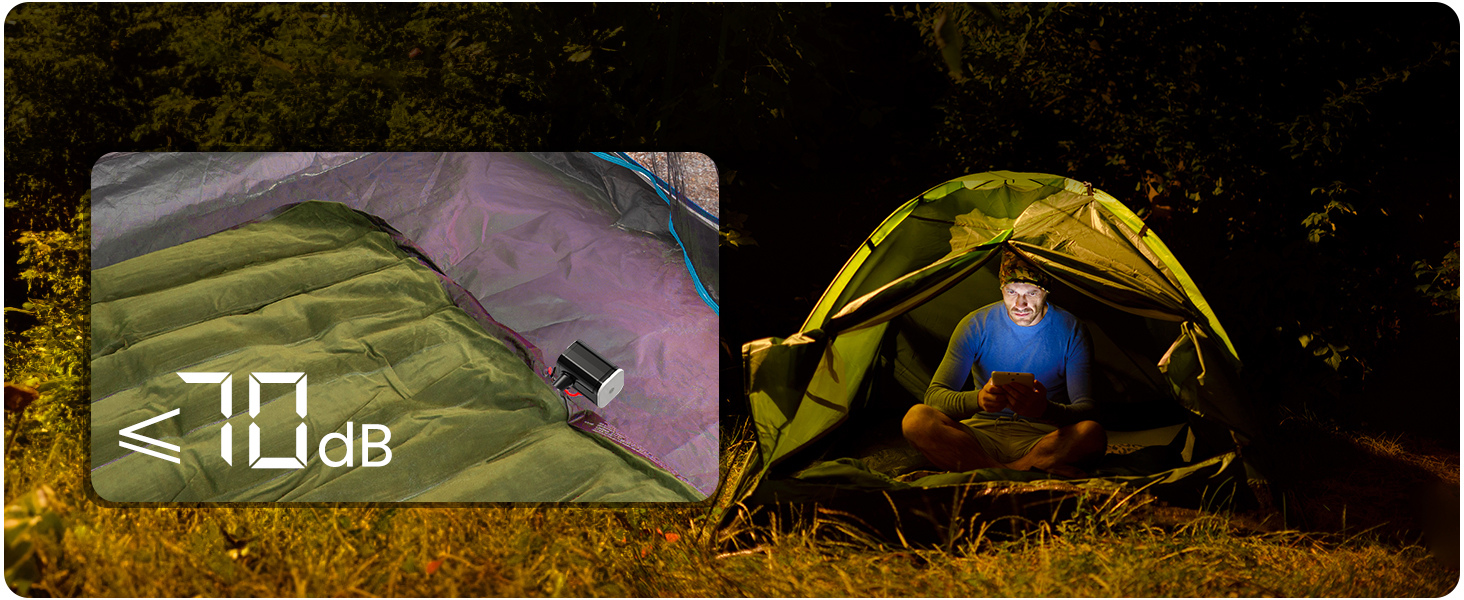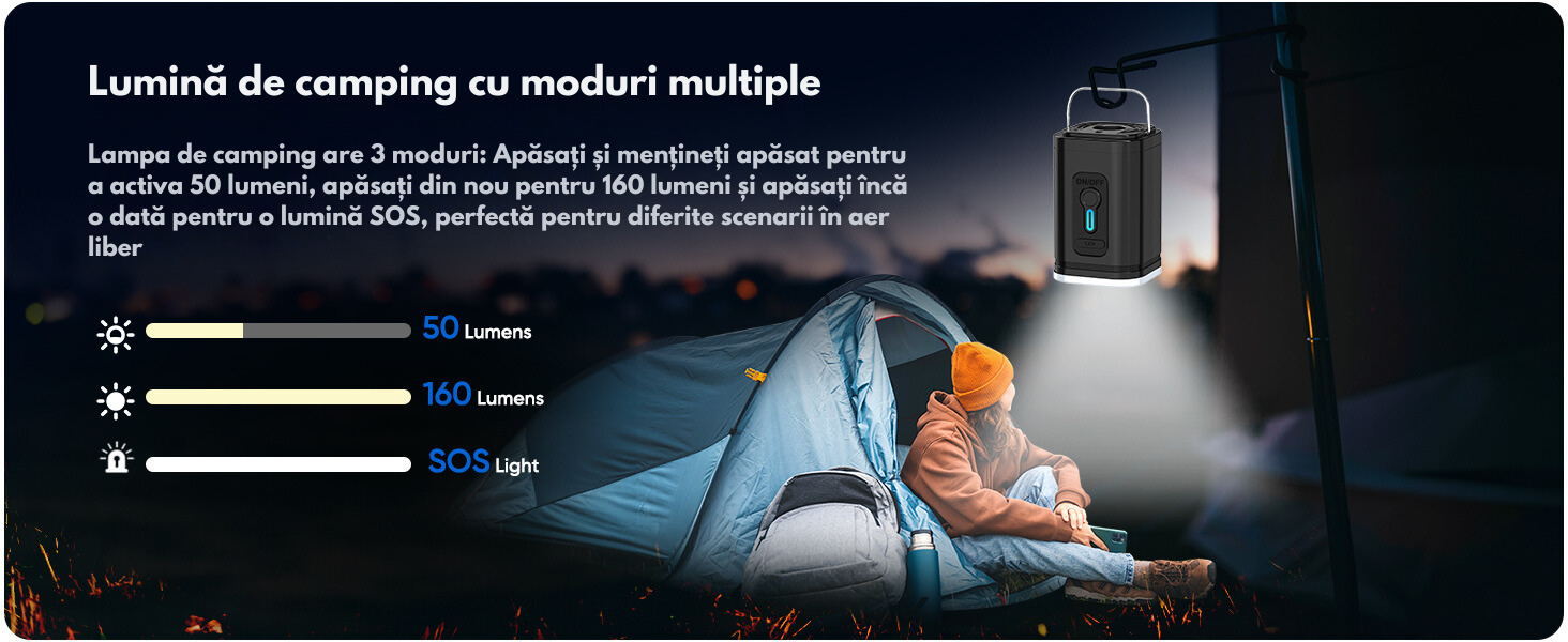 - Lanterna cu 3 moduri: Mini Air Pump Pro include o lanterna de camping cu 3 niveluri de luminozitate: 50 lumeni, 160 lumeni si mod SOS, perfecta pentru orice situatie in aer liber.