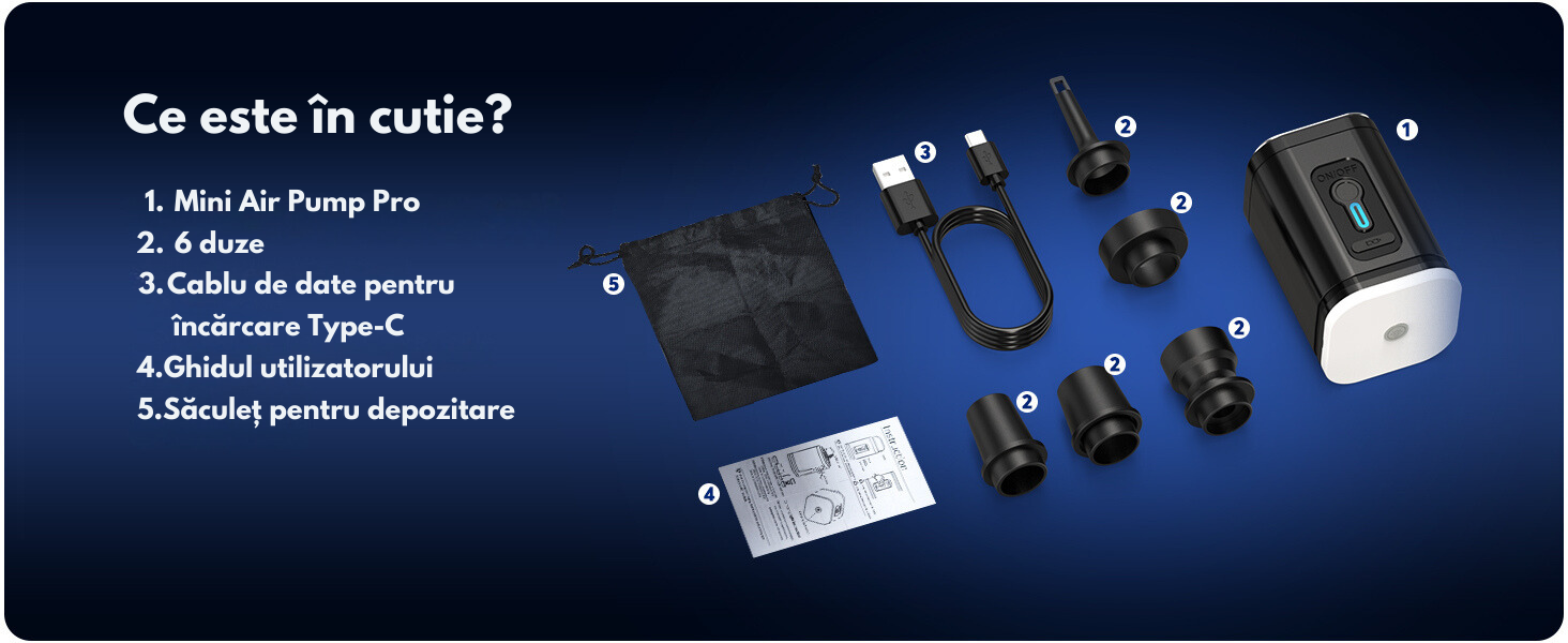 - 6 duze incluse: Acest kit complet vine cu 6 duze interschimbabile pentru a se adapta diferitelor tipuri de echipamente gonflabile, de la saltele si perne de aer, pana la colaci de inot si pungi de vid.