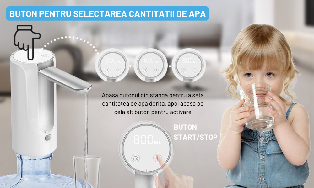 Pompa electrica de apa potabila imbuteliata este usor de utilizat de toate varstele, pompa de apa potabila are LED-uri tactile constand dintr-un "buton de reglare a apei" si un "buton de turnare/oprire a apei.
