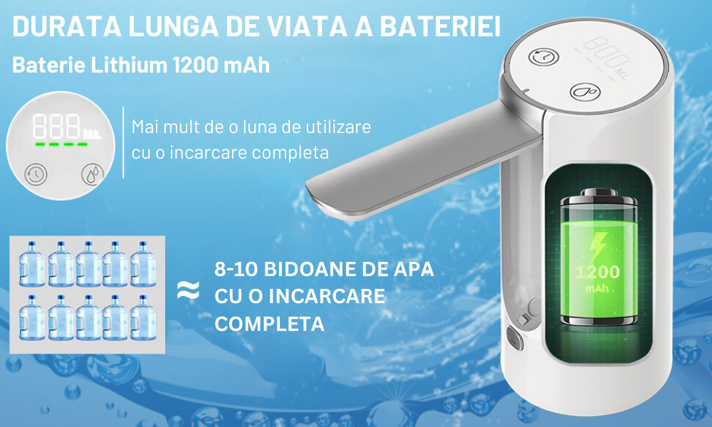 Baterie reincarcabila USB: baterie reincarcabila incorporata de 1200 mAh. Poate fi folosit timp de 30 de zile sau aproximativ 5-6 sticle de 20L de apa odata incarcata complet. Nu este nevoie sa incarcati in fiecare zi!