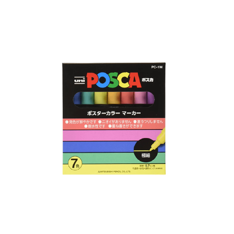 Acest set de markere POSCA din 7 piese are markere care pot fi folosite pe aproape orice suprafata la care poti visa - hartie, sticla, carton, lemn, portelan, metal, textile, ceramica, plastic si multe altele. Markerul PC-1M este markerul gamei POSCA, producand linii ingrijite si precise. Vopseaua opaca fara alcool si solventi acopera bine suprafetele, este amestecabila, se usuca rapid si poate fi stratificata atunci cand este uscata. Incepatorii ideali sunt profesionisti deopotriva, acest marker versatil este o alegere fluida si distractiva pentru arta, artizanat, graffiti sau decor. Varfurile pot fi clatite cu apa pentru a pastra markerul intact, permitandu-va sa amestecati fara teama de a va distruge markerul.