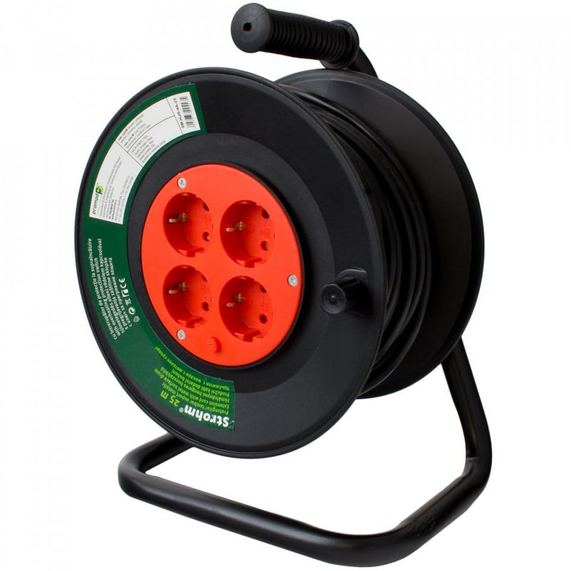 Prelungitor derulator 25m, 4 prize cu impamantare, cablu 3x1,suport plastic+metal, Strohm Prelungitor derulator 25m, 4 prize cu impamantare, cablu 3x1,suport plastic+metal, Strohm