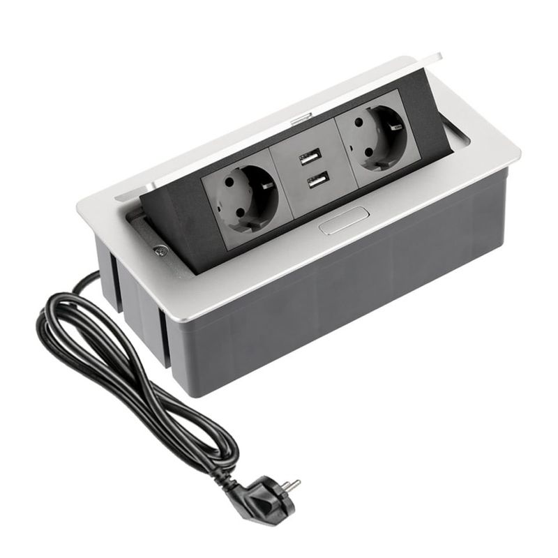 Priza incastrabila dreptunghiulara, 2 prize schuko 2 USB 5V 2.1A este o extensie desktop pentru prize si USB GTV, incorporata in combinatia de culori aluminiu si negru. Montata pe o masa sau pe alta suprafata, in pozitie de nefunctionare, capacul unitatii este la acelasi nivel cu blatul mesei. Daca este necesar, unitatea se deschide cu usurinta prin apasarea unui buton, iar toate prizele sunt disponibile pentru utilizare. Este solutia ideala pentru o masa de lucru confortabila si convenabila, birouri, bucatarii etc. Priza incastrabila dreptunghiulara, 2 prize schuko 2 USB 5V 2.1A este un element functional util al interiorului biroului sau pentru orice incapere din casa ta. Dispozitivul este instalat pe blat si in starea de neutilizare este ascuns de privitori. De indata ce ai nevoie de o priza, vei deschide zona de lucru a prelungitorului cu o atingere usoara si iti vei conecta computerul, telefonul, lampa sau alt gadget la retea.