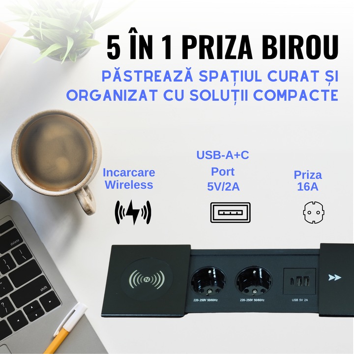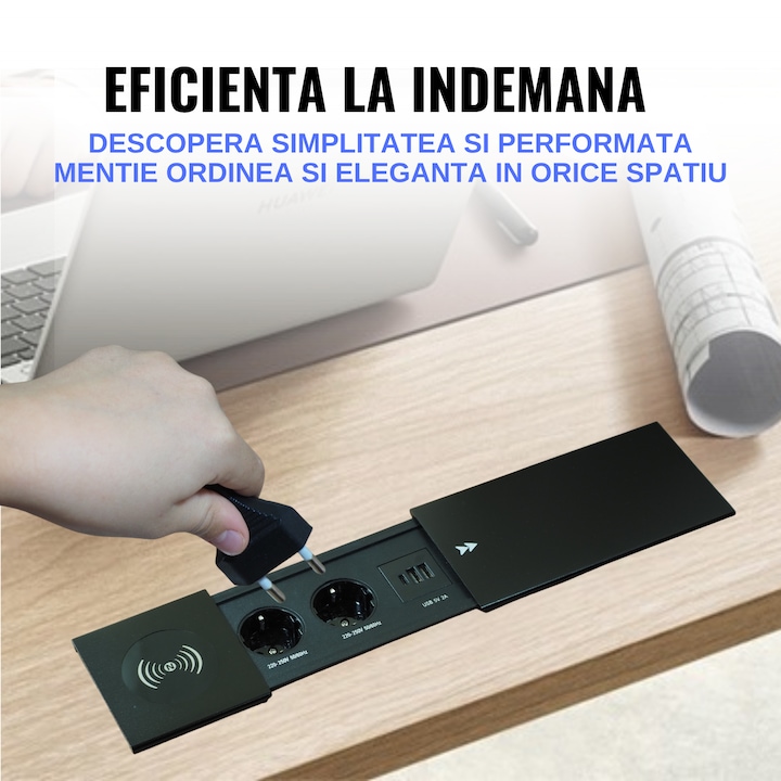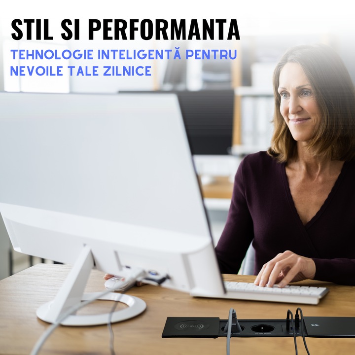 Cu multiple porturi USB, functie de incarcare wireless si design sofisticat, este alegerea perfecta pentru cei care vor un spatiu de lucru modern, bine organizat si tehnologic avansat.