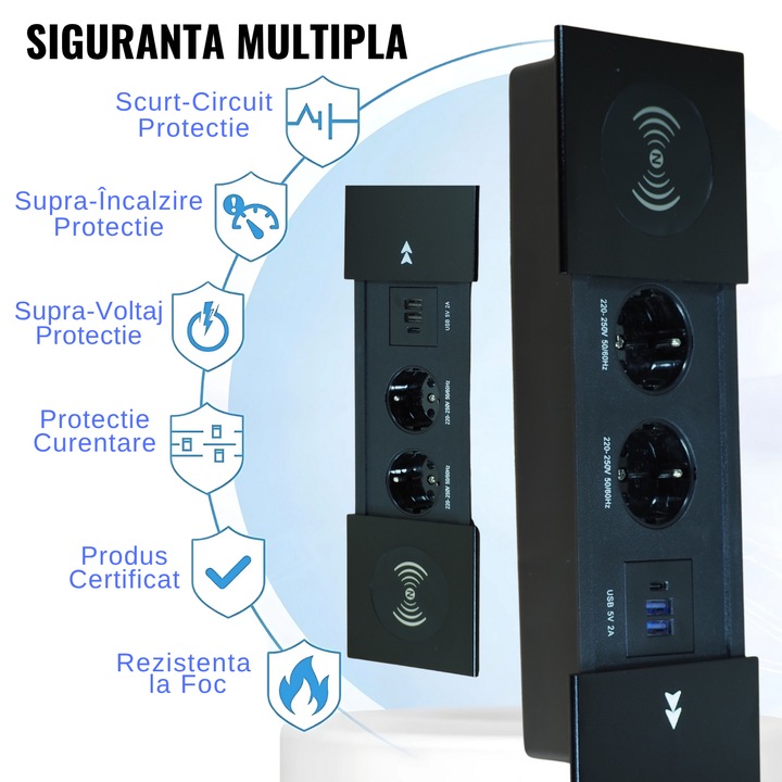 ✅ Siguranta completa – materiale ignifuge, protectie la supratensiune si capac glisant pentru protectie impotriva prafului.