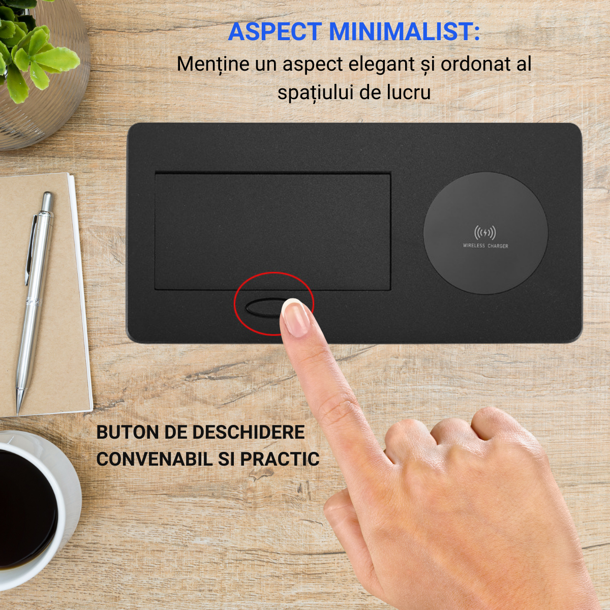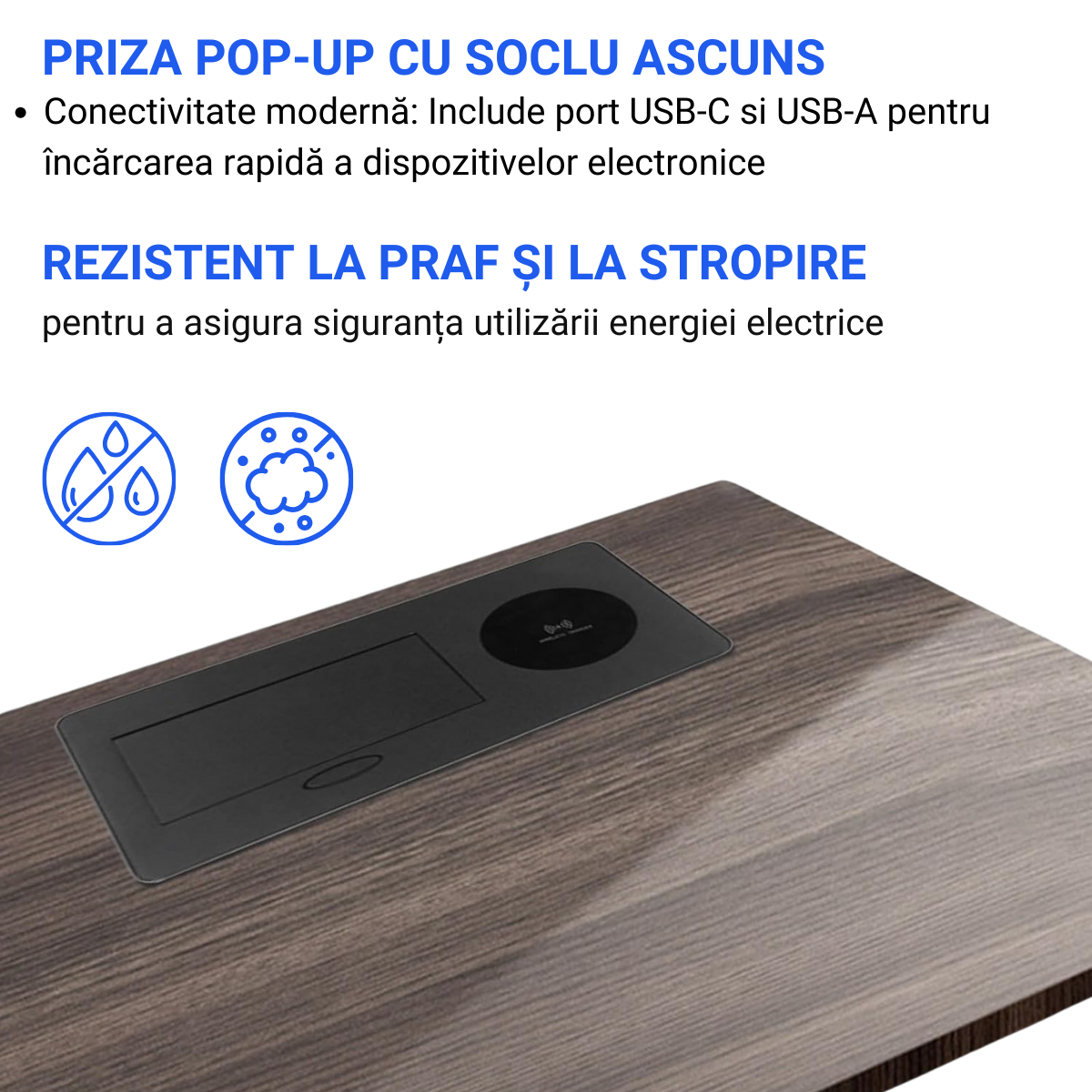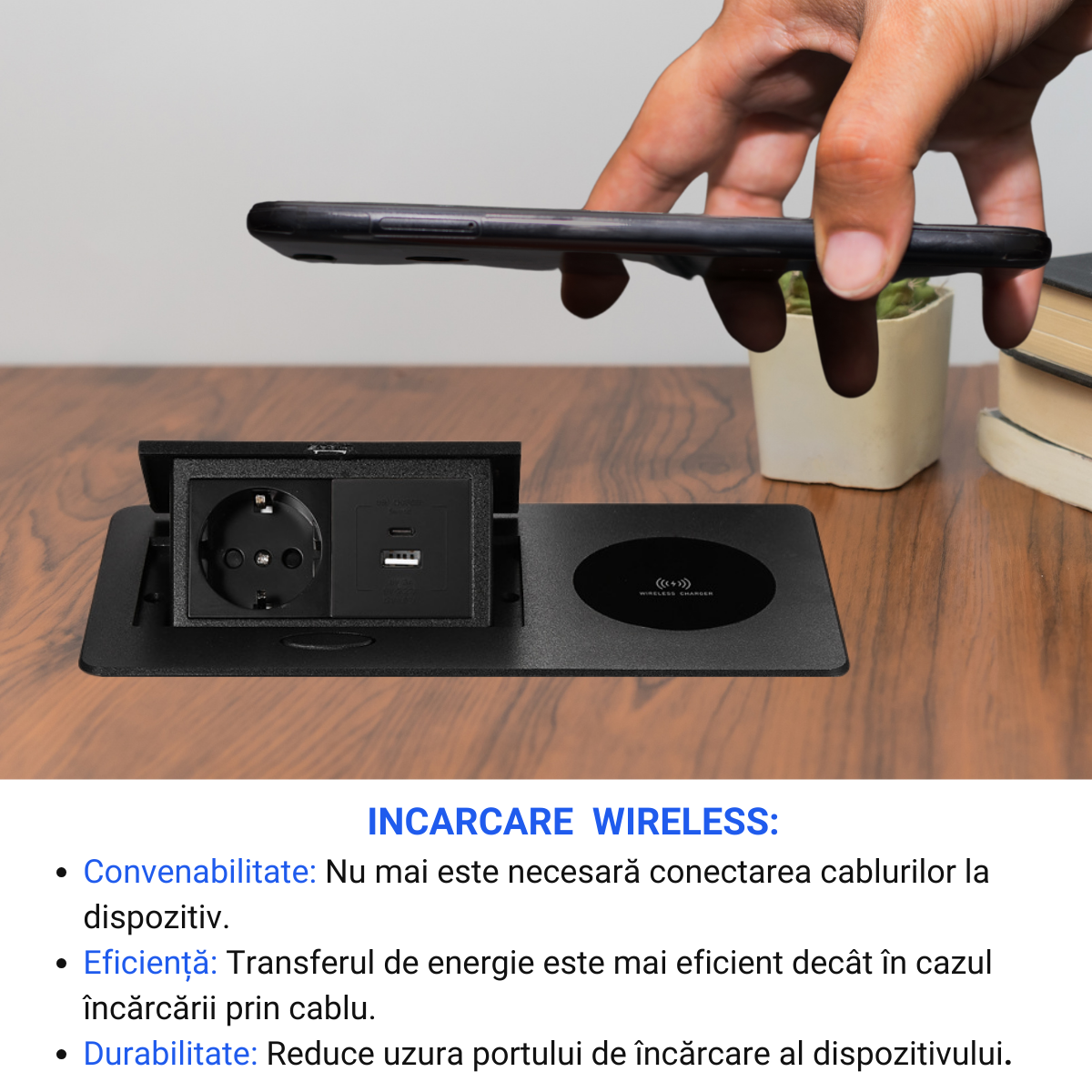 Priza Incorporabila in mobilier, ATOMKIT, 1 Prize Schuko, USB-A+C, WIRELESS, Conductori cupru,, Cablu 1.8 m, Negru Priza Incorporabila in mobilier, ATOMKIT, 1 Prize Schuko, USB-A+C, WIRELESS, Conductori cupru,, Cablu 1.8 m, Negru