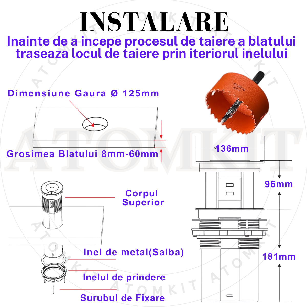 • Dimensiunea gaurii de montaj: 125 mm, compatibila cu blaturi de grosime 8-60 mm.