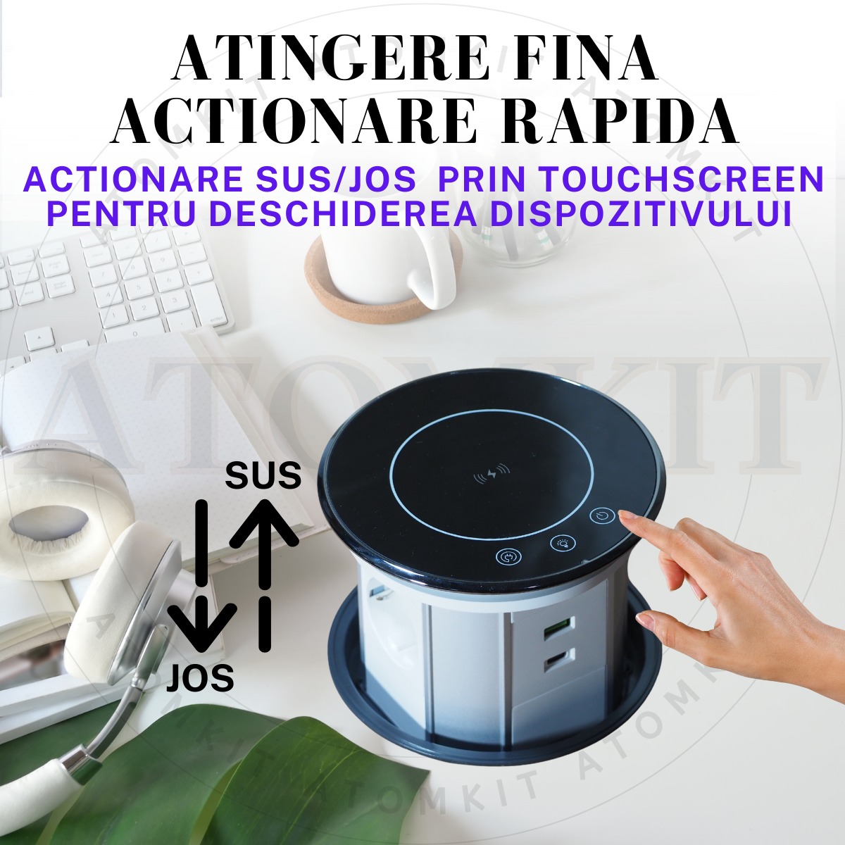 Priza incorporabila retractabila ATOMKIT® One, incarcare wireless 15W, 3 prize, 2 porturi USB, 1.5M cablu, Negru Priza incorporabila retractabila ATOMKIT® One, incarcare wireless 15W, 3 prize, 2 porturi USB, 1.5M cablu, Negru