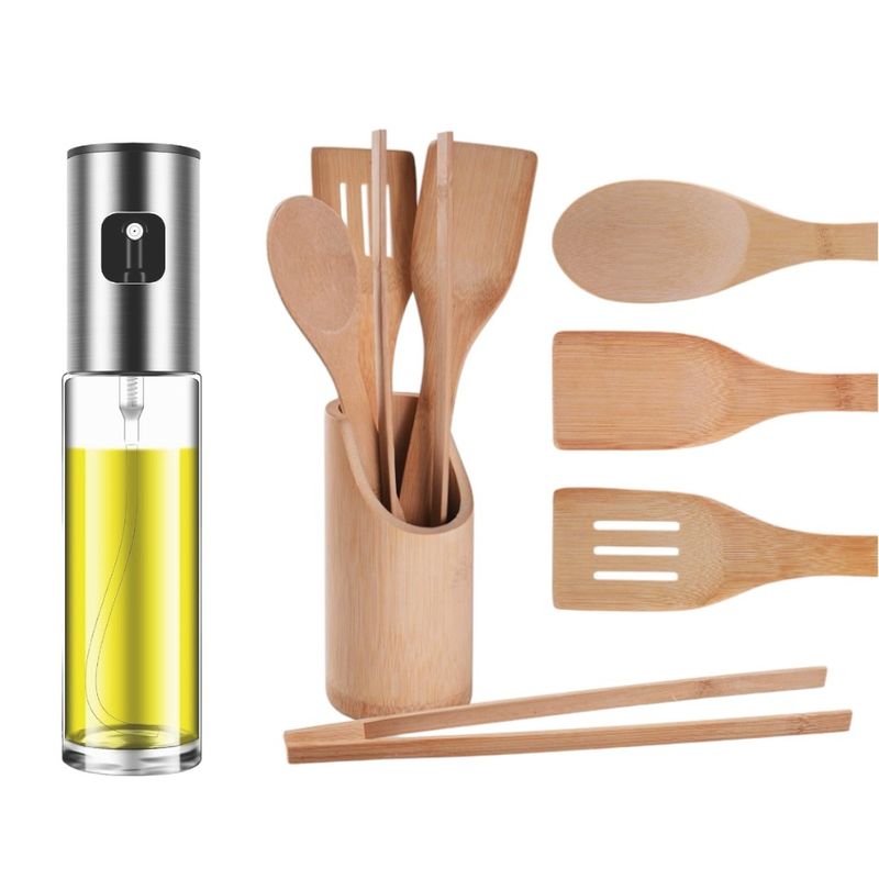 Setul include 4 ustensile de bucătărie practice, realizate din bambus natural, alături de un suport elegant pentru pahar, pentru o organizare eficientă și estetică a bucătăriei tale.