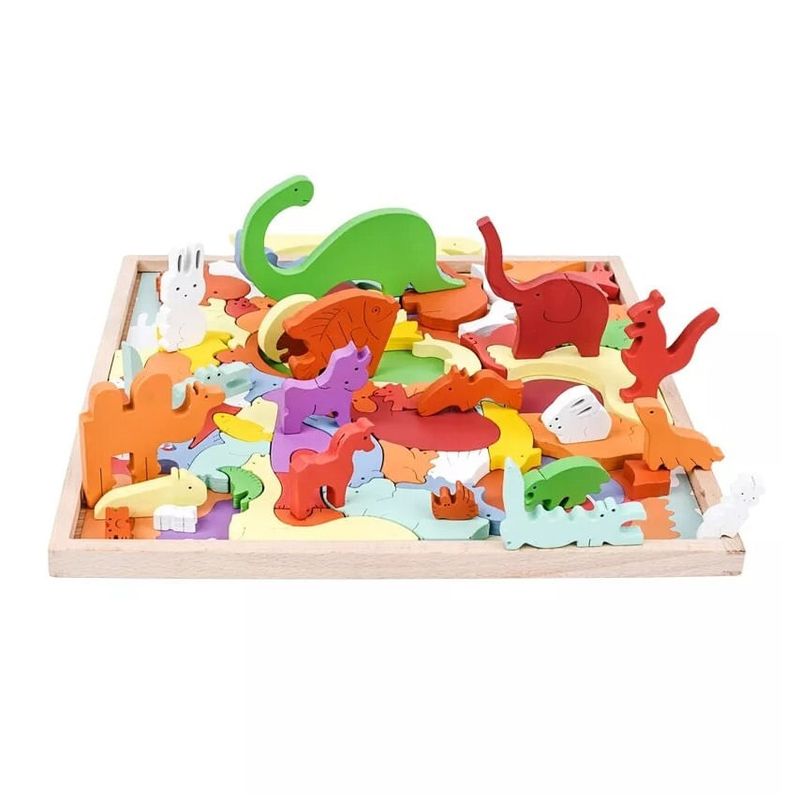 Puzzle-ul este format din forme de animale prietenoase, fiecare piesa fiind atent finisata si colorata cu vopsele non-toxice, sigure pentru copii. Acest joc stimuleaza recunoasterea culorilor si a formelor, incurajand copiii sa isi dezvolte gandirea logica si abilitatile de rezolvare a problemelor.