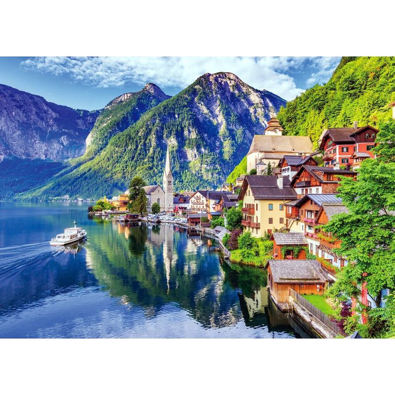 Puzzle TinyPuzzle - Hallstatt Lake and Village with Boat, 99 piese Puzzle TinyPuzzle - Hallstatt Lake and Village with Boat, 99 piese