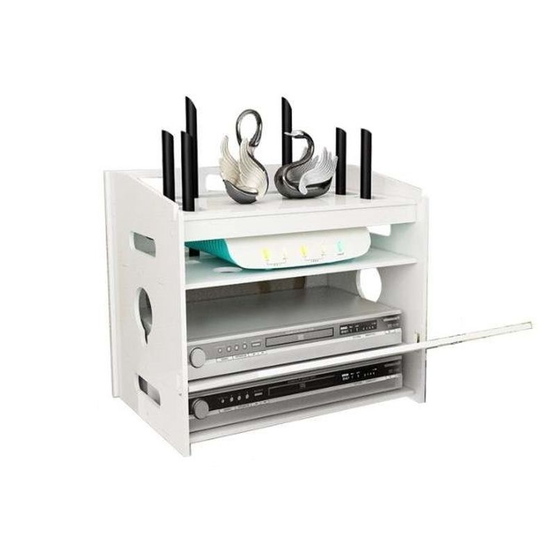 【Trei compartimente cu orificii pentru aerisire】Raftul suport de culoare alba are 3 compartimente, care sunt convenabile pentru depozitarea diverselor articole si aparate electrice. Orificiile laterale permit o organizare eficienta a cablurilor si a firelor.