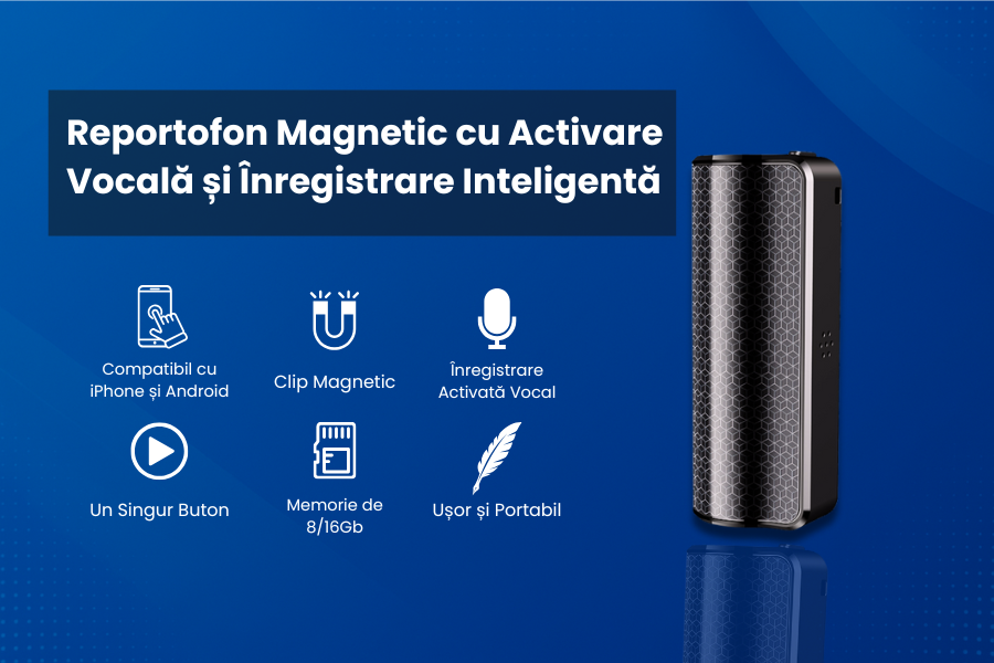 Descopera Reportofonul Magnetic cu Activare Vocala ZeroSecrets, un dispozitiv compact si inteligent, perfect pentru inregistrari discrete si eficiente. Compatibil cu iPhone si Android, acesta ofera o experienta simpla si intuitiva, avand un singur buton pentru operare rapida.