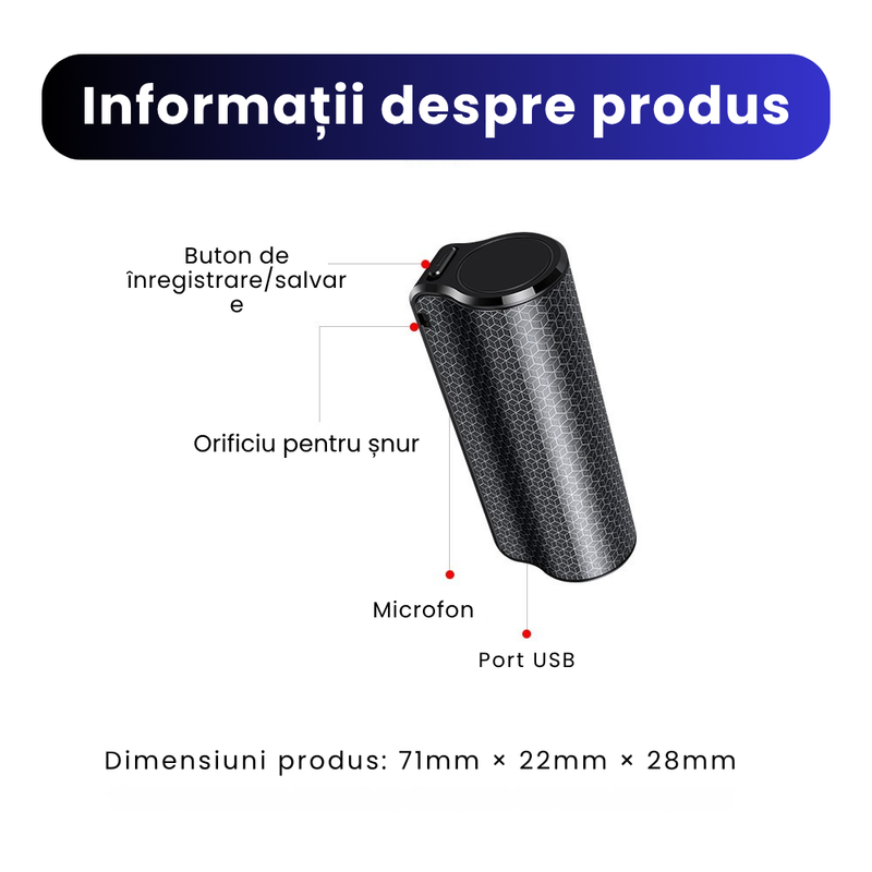 Datorita functiei de activare vocala, inregistreaza automat doar atunci cand detecteaza sunet, economisind spatiu si energie. Cu 8GB/16GB memorie, ai suficient loc pentru ore intregi de inregistrare. Clipul magnetic iti permite sa-l fixezi usor pe orice suprafata metalica, iar designul usor si portabil il face ideal pentru utilizare zilnica, fie la birou, fie in intalniri importante.