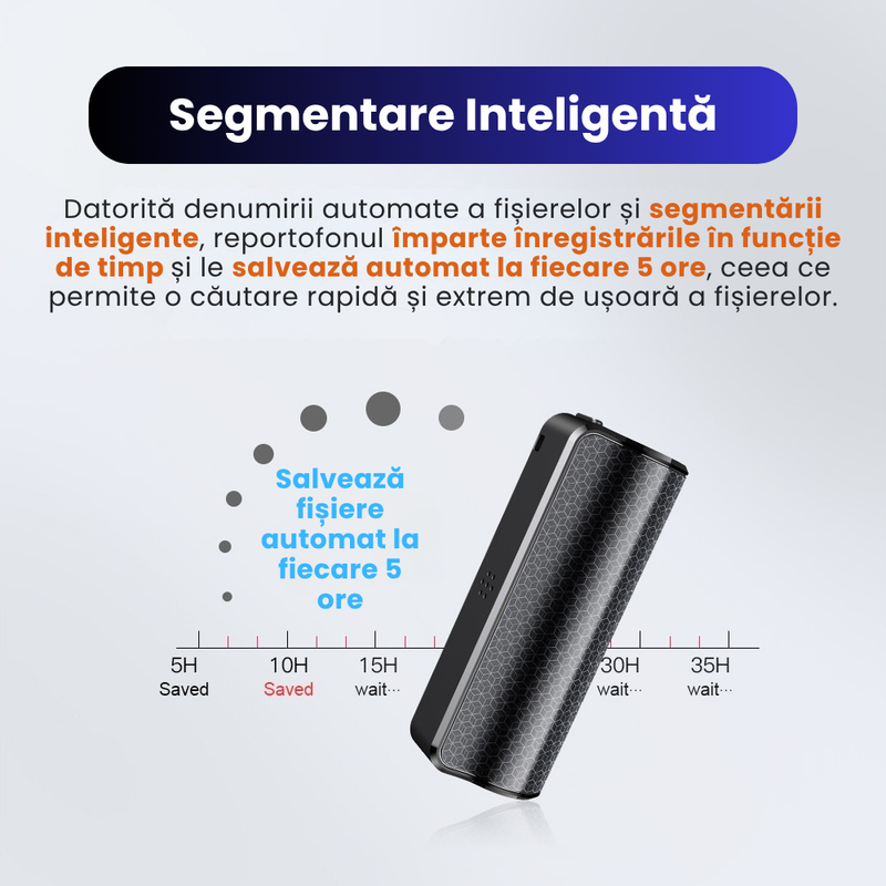 Datorita sistemului de denumire automata a fisierelor, fiecare segment este salvat clar si ordonat, oferindu-ti acces rapid la informatiile de care ai nevoie. Aceasta functie este ideala pentru inregistrari de lunga durata, precum sedinte, conferinte, cursuri sau supraveghere audio, permitandu-ti sa gasesti usor momentele esentiale fara sa parcurgi ore intregi de inregistrari.